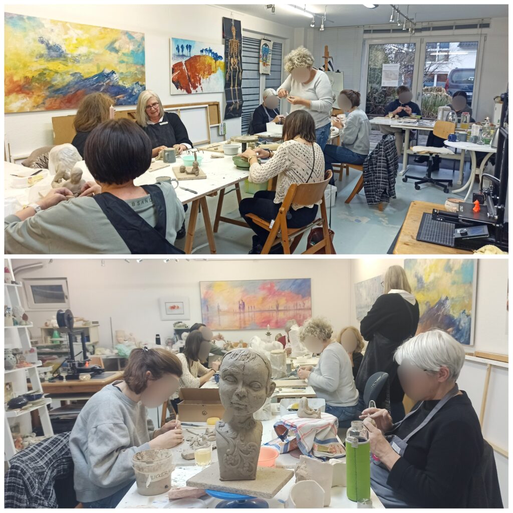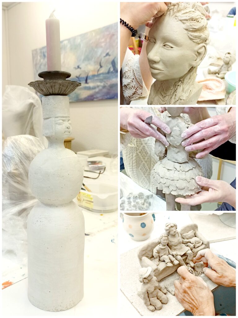 In Gruppenkursen wird frei modelliert: Die Modelliertechnik eröffnet nahezu unbegrenzte Gestaltungsmöglichkeiten. Egal, ob es um die Herstellung von Gefäßen und Geschirr oder um künstlerische Skulpturen und Objekte geht – all das ist mit dieser Technik möglich.